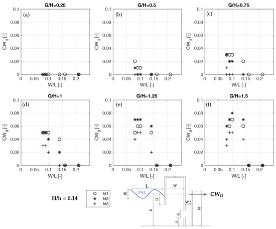 For the smallest incident wave height considered in this study (H/h = 0.14, Figure 8), fixing G/H and W/L, the intermediate height of the overtopping threshold ht2 gives higher CWII than the lowest threshold ht1 for high gap apertures G/H (i.e., G/H = 1.25 and G/H = 1.5, Figure 8e,f). Instead, for intermediate G/H values (G/H = 0.5–1, Figure 8b–d), higher CWII is obtained with ht1. In such conditions, the lower wave energy transmission through the smaller submerged gap, with the consequent smaller oscillation amplitude in the second chamber, shifts the optimal working configuration towards that comprising the reduced hydraulic head and the higher overtopping rates obtained with the lower threshold ht. This trend towards a decrease of the optimal overtopping threshold height for decreasing G/H takes place regardless of the value of the relative chamber width W/L, i.e., it is quite insensitive to the incident wavelength.