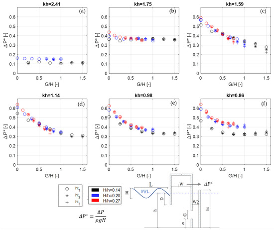 Dimensionless pressure parameter ∆P* as a function of the relative size of the submerged aperture G/H for different relative water depths: kh = 2.41 (a), 1.75 (b), 1.59 (c), 1.14 (d), 0.98 (e), 0.86 (f).