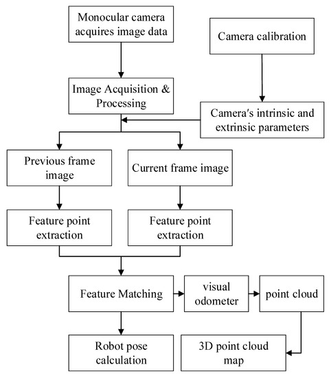 The underground tunneling face of a coal mine has the characteristics of low illumination, long and narrow channels and numerous pieces of equipment, which poses challenges to the precise positioning of tunneling equipment. Therefore, with the coal mine roadway environment as the feature, the tunneling equipment positioning method with uniocular vision as the core was constructed. The monocular camera and the tunneling equipment were firmly connected. By collecting the environmental images of the underground coal mine roadway, introducing the in-camera parameters with calibration in advance, the image preprocessing method was used to realize image enhancement, filtering and distortion correction, and then the ORB feature extraction method was used to extract the feature points, and the RANSAC algorithm was used to eliminate the mismatched points [20]. Finally, the pose estimation between adjacent frames was realized according to the principle of polar geometry constraints. The three-dimensional spatial coordinates of feature points were calculated by the triangulation depth calculation method. Then, the position information of the tunneling equipment was calculated in real time. By solving the pose of the tunneling robot, the 3D point-cloud registration between image sequences was realized, and sparse 3D space points were recovered from the collected images. Positioning process of coal mine heading equipment based on uniocular vision is shown in Figure 1.