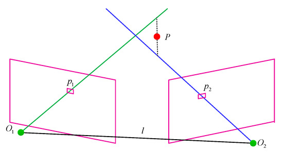 According to the principle of monocular visual measurement analysis, one cannot obtain pixel depth information through only one single picture, so this needs to be conducted by triangulation. According to the frame between postures, to extract the roadway characteristic point depth estimation, triangulation between two perspective angles and the realization of the point distance calculation is required, thus the measurement principle is as shown in Figure 5:
