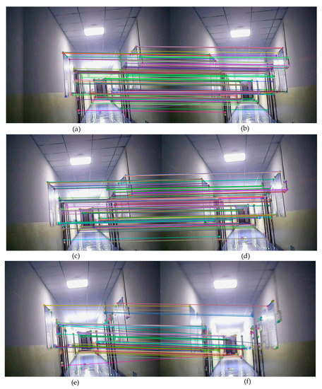 Figure 6 shows the matching process of four adjacent frames. It can be seen that in the dark corridor environment, the roadway feature extraction effect obtained by the ORB feature extraction method is represented in color in the figure. After mismatching and elimination, fewer feature points were extracted to meet the requirements of the ORB feature extraction. Based on the feature point extraction, the feature point matching between each picture frame was realized, and the average matching time of each of the two frames was 179 ms, which met the real-time requirements of feature extraction and matching.