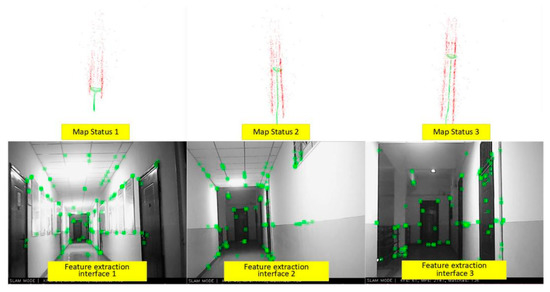The green part of the feature extraction interface is the extracted and matched feature points of the corridor and corridor, the green part of the map state interface is the track of the robot and the red points are the three-dimensional sparse roadway points under construction. It can be seen that the visual feature points extracted on each frame picture were relatively rich, and the robot’s movement track was relatively stable with good stability, which is not easy to obtain in feature loss.