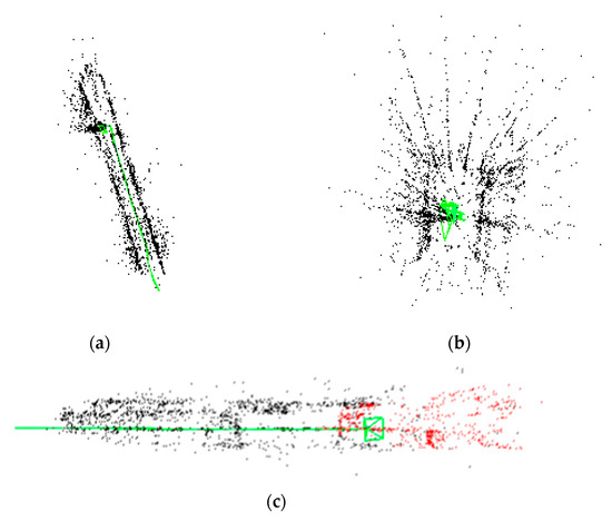 Figure 8a–c shows the constructed three views of the sparse-point cloud for the three-dimensional roadway realized by monocular vision, respectively. The black point cloud shows the roadway feature points extracted and registered, the green line is the robot track, the green box is the real-time pose of the robot and the red points are the feature points under construction. The global map of the roadway composed of sparse point cloud could be found by overlooking, from a side view and face view, which was roughly in line with the roadway trend, and the three-dimensional roadway reconstruction based on the sparse-point cloud was initially realized.