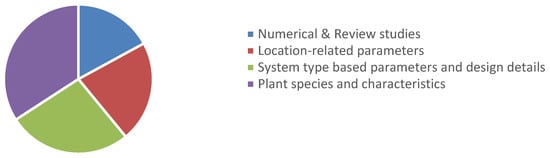 As already emphasised, an extensive literature review was conducted. The thermal performance of vertical green systems, the shading effect, the energy-saving potential and heat flow mechanisms were analysed. During the review, ‘thermal performance of vertical green façades’ and ‘thermal performance of living walls’ concepts were searched for in ScienceDirect, Google Scholar and MDPI databases. More than 500 peer-reviewed journal articles and conference papers published between 2010 and 2022 were screened in order of relevance to the search terms. Studies not related to vertical green façade systems or their energy efficiency were eliminated. It was determined that the rate of articles directly related to the subject was approximately 20%. Then, after a second round of selection, 40 of the most relevant articles were chosen for detailed analysis. During this selection process, priority was given to studies investigating the energy efficiency parameters of vertical green façades through a comparison with different values in the same environment. For example, the authors looked at the comparison of different air gap dimensions or leaf area index (LAI) values under the same conditions or observations of the behaviour of the same experimental setup under different weather conditions. Since the purpose of the literature review was to examine the energy efficiency parameters specifically, studies with a single case that did not allow comparison within their setup or with the studies of other authors were not selected for further analysis. Studies that were carried out in different climatic conditions with different systems and plant species, as well as numerical studies explaining heat flow mechanisms for vertical green façades, were also reviewed. The results of the analysis were presented under three main groups of energy efficiency parameters related to: location; system type, including specific design details; and plant species and their characteristics. The distribution of the total number of articles reviewed in the study according to the analysis groups is shown in Figure 1.