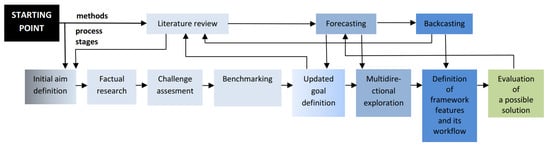 Figure 2 explains that the combination of a literature review, forecasting and backcasting—following the proposed hierarchy—can be successfully applied during different stages of the design process and, thus, foster a proposal that targets multiple and diverse aspects of the challenge. Within the open end of the scheme, the last step of the process, i.e., the evaluation of the possible solution, can engage previously used methods to validate the obtained results. The validation can be performed as a final check before further framework development or when new relevant data is presented to the researcher, guaranteeing that the process will be agile, resilient and up-to-date. The scheme advocates for the hybridisation of methods that results in the highest efficiency of the design process. As the researched challenges and their most effective solutions are multi-faceted, the same diversity of means should apply to the methods engaged in designing the research process itself.