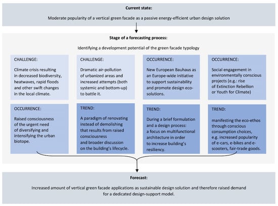 Following a literature review, the next method used is forecasting—with known, contemporary trends engaged in speculating on the unknown future. Forecasting is about organising the existing challenges, occurrences and trends into a gradual scheme to establish the current and future development potential of a design support model. Analysing multi-threaded events and circumstances connected to ecology, sociology, technology and design development helps diagnose the actual need for such a model and renders the positive changes it can provide for the design of energy-efficient vertical green façades. The forecasting method used in the early stage of a design process helps validate the initial idea and indicates the circumstances to consider when reviewing strengths, weaknesses, challenges, and chances, therefore developing the strategic planning of the model. Figure 3 explains how the forecasting method was used when researching the potential of the vertical green façade application. Firstly, the authors speculated if a vertical green façade was a sustainable design solution that would gain popularity among designers and non-professionals as a means to mitigate the effects of the climate crisis and manifest an eco-ethos of contemporary city-dwellers. Then, the authors researched if a potential rise in vertical green façade implementation would boost the demand for a dedicated design support model.