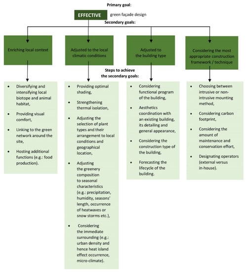- To design an energy-efficient vertical green façade, a designer should follow the four consecutive steps: determination of the purpose and objectives of the system, location analysis, definition of the detailed features of the system, and selection of the plant species.