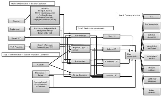 In the first step of the design support model, the architect defines four main elements. Firstly, the purpose(s) of the system is identified. In order to design energy-efficient vertical green façade systems, it is necessary to examine the energy balances and understand the effective factors. Energy flow in vertical green façades is related to the mechanisms of convection, conduction, radiation, and evapotranspiration. Authors such as Scarpa et al. [15], He et al. [10], Susorova et al. [9] and Convertino et al. [11] have proposed numerical models to explain and calculate the energy balance of green façades and living walls. The models are validated with the experimental method. The fact that plants are alive and that they respond to external actuators does not allow their thermal performance to be predicted with 100% certainty by models; however, with some assumptions, results can be obtained with negligible margins of error. For example, a study [9] simulating the thermal performance of direct green façades with a one-dimensional heat flow model has examined short-wave radiative transmission through the plant layer, long-wave radiative exchange between the plant layer and the environment, convective heat transfer to and from vegetation, and evapotranspiration from leaves. However, plants were assumed to always be in the growing season. Individual leaf angles were not considered. Leaves were uniformly distributed. Leaf absorptivity, leaf dimensions, the leaf area index, the radiation attenuation coefficient, and plant stomatal conductance were constant. Values that vary with altitude, such as wind speed, were considered constant. The level of soil moisture at plant roots was constant.