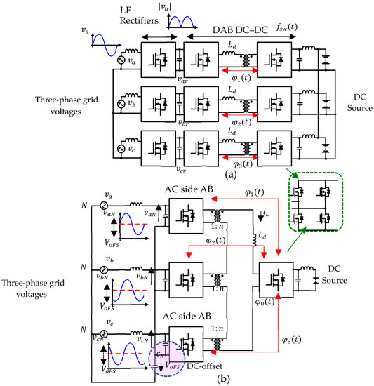(a) Three single-phase DAB AC–DC converter [31], (b) three-phase QAB AC–DC converter with series-connected HF transformers [32].