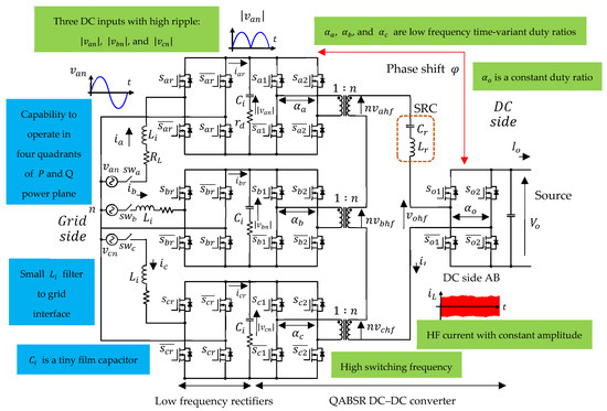 First, is the absence of the bulky DC-link capacitors for power decoupling. Indeed, in the proposed converter, the DC-link capacitors (see Figure 2) are sized to filter the HF current having a very small capacitance values, thus making it a single-stage AC–DC converter [31]. Hence, the three rectified grid voltages (which are DC voltages with high ripples) and the DC source are the QABSR DC inputs. In contrast, in the two-stage three-phase AC–DC converter, the DC-link capacitors have a larger capacitance value and the QAB has four DC inputs with a very small ripple [35,36,37,38,39,40,41,42,43,44,45,46,47].