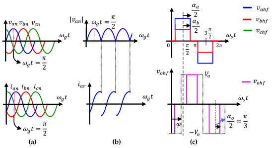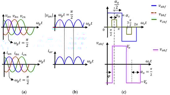 Proposed modulation without reactive power injection (). (a) Grid voltages and currents, (b) rectified grid voltage and current, (c) HF modulated voltages at .