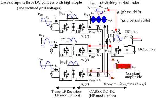 The working principle of the proposed converter is graphically presented in Figure 5. Note that two frequency modulations are employed: at LF by the three rectifiers and at HF by the QABSR DC–DC converter.