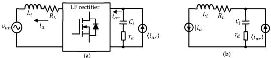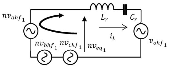 On the other hand, the SRC is designed to obtain a high selectivity at . Hence, the equivalent SRC at steady state is shown in Figure 6. The voltages , , and are the harmonics at of the modulated voltages which, according to (10) and (11) are provided by: