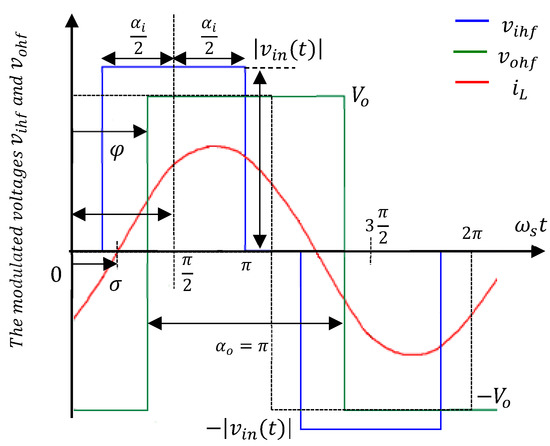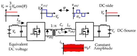 where the DR angle and the PS angle take a constant value throughout the grid period. Because and have constant amplitude and DR, the HF current also has a constant amplitude throughout the grid period. Hence, the QABSR steady-state response is similar to that of a DABSR DC–DC converter [50,51] as shown in Figure 7, where HF current amplitude is controlled using the PS angle .