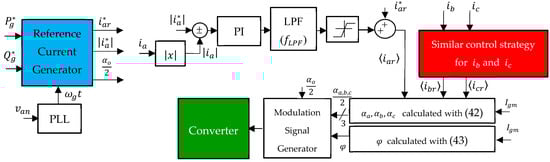where , provided by (22), takes a constant value throughout the grid period. Note in (30) that the PS angle is repeated in the three grid currents, while the DR angles are independents for each grid current. Thus, in the proposed control strategy, the PS angle is used to control the grid current amplitude, whereas the DR angles , and are used to generate the rectified grid current angles provided by (8). Then, the angle is calculated as: