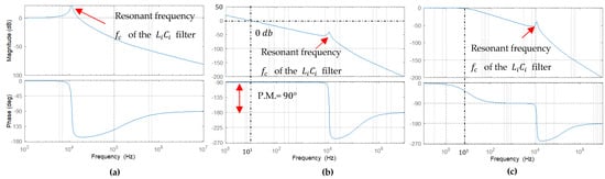 Moreover, the tank circuit is designed as a band-pass filter at the switching frequency . For this purpose, the quality factor is chosen with a high value (), while the resonance frequency is selected closest to () [50,51]. These parameters are defined as: