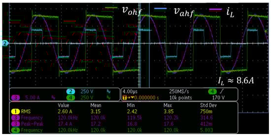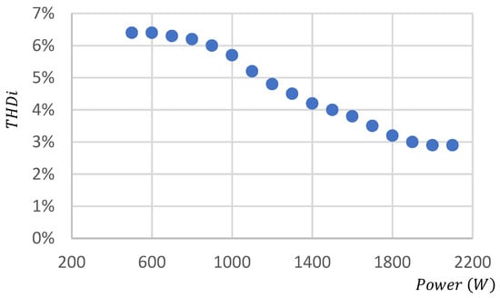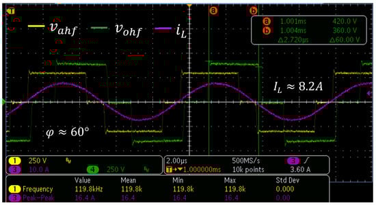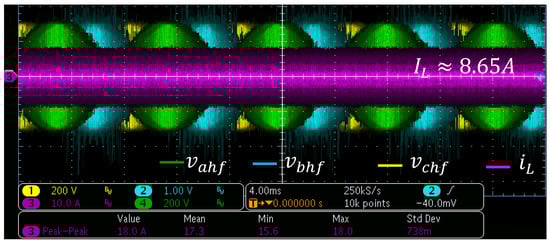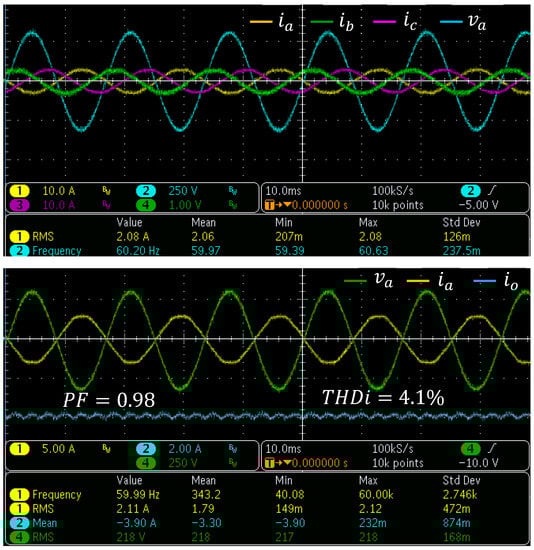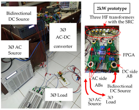 A brief comparison with similar single-stage AC–DC structures [29,30] is shown in Table 3. In [29], three independent DABs were used (see Figure 1a). A similar approach can be implemented using three SSIB single-phase DABSR AC–DC converters [60]. However more SRC are required. Moreover, for that case, each SRC must be designed considering the single-phase time-variant power (whose maximum value is the double of the nominal power), and the converter size must be increased [50]. Hence, the use of three-series-connected HF transformers on the secondary side, one SRC, and the proposed modulation, allowing three-phase power decoupling and compensating for the high DC ripple, is a better option. In contrast, the three rectifiers were avoided in [30] because a DC offset was added in the neutral reference of the grid (see Figure 1b). However, HF transformers and the MOSFETs on the AC side must be sized for double the voltage compared with the proposed converter. Although the QAB structures are quite similar, according to (12) and (14), the HF three-phase power decoupling was not obtained using only time-variant PS modulation as proposed in [30]. Besides that, the proposed modulation and the control strategy have less complexity. Similarly, in the proposed converter, a smaller grid current THDi is obtained (2.9%) and, the modulation and control are easier to implement.