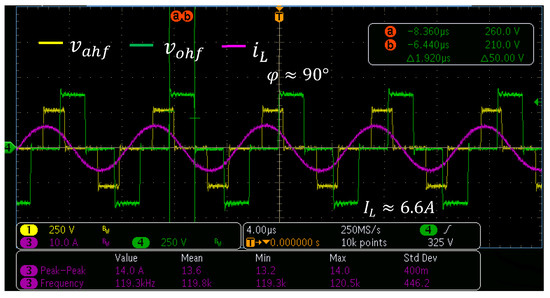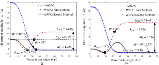 According to (20), the voltage on the secondary side of the HF transformers , where is the grid displacement power factor angle, takes its maximum value when only active power P is injected . However, is decreased when reactive power is injected which, according to (28), has a direct impact on the HF current amplitude . The critical case is when only reactive power is injected, which means, , and . For this case, using (28), is provided by: