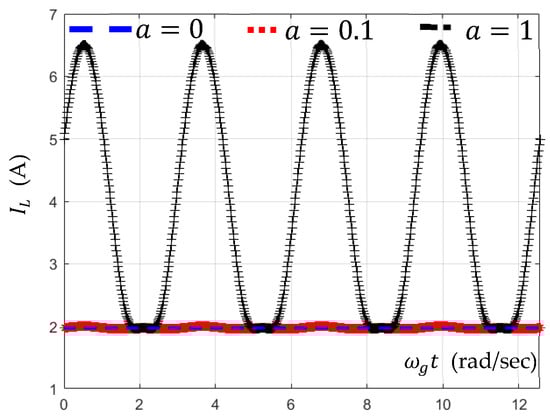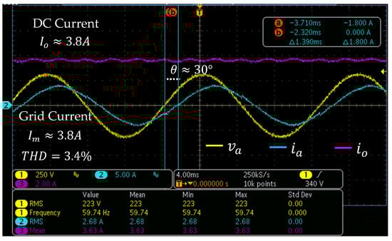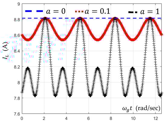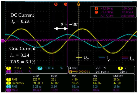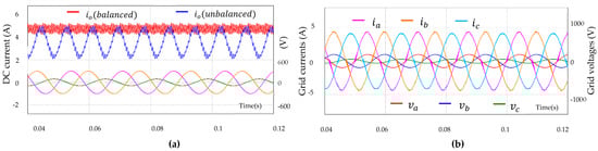 Three balanced grid currents are controlled considering an amplitude A and a voltage drop of in (45). Unbalanced grid currents are not covered in this article. Simulation results are shown in Figure 27. Note in Figure 27a that, a LF ripple is present on the DC output current because of the unbalanced conditions. However, the grid currents are not affected, as shown in Figure 27b, because it depends on SCR parameters, the DC output voltage, (which are constants in a grid period), and the closed-loop control in the natural frame [59] implemented using the DR , and as command signals.