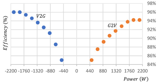 A similar analysis can be performed for vehicle-to-grid (V2G) power flow. For this case, the four ABs are in ZVS mode even when the DR , , or take small-angle values. Hence, this converter has lower switching losses in V2G mode than in G2V mode. However, for reactive power compensation can take a small-angle value and the ZVS is affected on the DC-side AB. Hence, a compromise between obtaining a small HF current amplitude value and losing the ZVS mode must be taken.