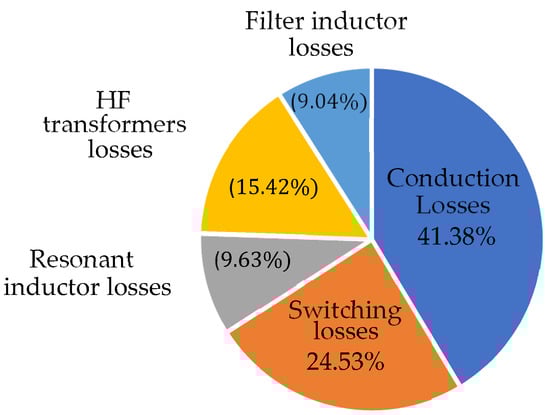 Finally, the MOSFET quantity and the switching mode were compared. In the proposed converter each grid voltage is independently modulated. For this purpose, three LF single-phase (3-1) rectifiers linked with a QABSR DC–DC converter was used. Hence 28 MOSFETs were used. A similar structure was used in [39]. However, the functionality of the proposed converter is quite different because the rectifiers switch at LF and ZVS mode unlike [39] where the 3-1 VSIs switch at HF and hard-switching (HS) mode. Hence, the proposed converter presents higher efficiency. Instead, only 14 MOSFET were used in [8]. However, the VSI switches at HF and HS mode which affects the converter efficiency. This problem is increased by the bulky L filter, unlike the proposed converter where all the ABs switch at ZVS mode and uses smaller L filters. Hence, even if in the proposed converter the MOSFET quantity is greater, higher efficiency is obtained because the LF switching in rectifiers and the smaller L filters.