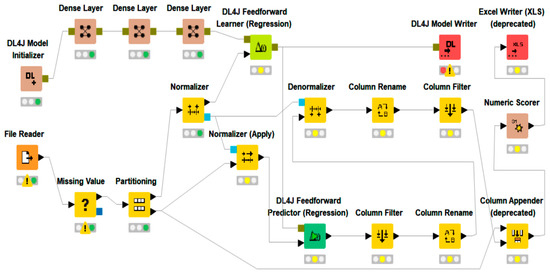 For building the deep learning models, four nodes are needed, which are (1) DL4J Model Initializer, (2) Dense Layer, (3) DL4J Feedforward Learner (Regression), and DL4J Feedforward Predictor (Regression). First, the DL4J Feedforward Learner node is used for training the models. This node needs many hyperparameters, such as the batch size, the number of epochs, the learning rate, and the optimization algorithm. Once this node is executed, the DL4J Feedforward Predictor predicts on the test set. Finally, the data are denormalized, and the model performance is evaluated using the Numeric Scorer node.