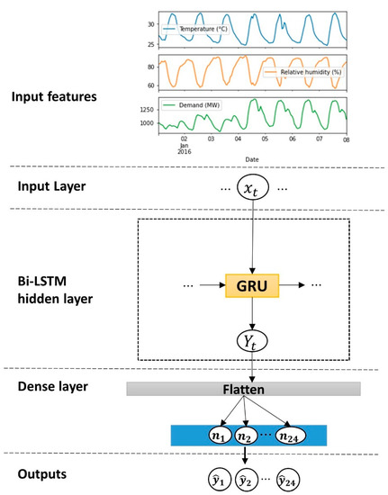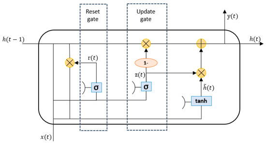 in which , , and represent the parameters of the reset gate and , , and . Figure 5 demonstrates the architecture of the GRU model for predicting electricity demand.