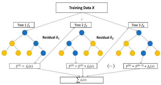 Extreme gradient boosting (XGBoost) is an ensemble machine learning method based on gradient boosting. It has become popular due to its success in Kaggle competitions. It uses a regularization term that helps to improve model generalization and overfitting. Some advantages of XGBoost are scalability, cache optimization, and the handling of missing data. In addition, XGBoost can be run on distributed platforms such as Spark to accelerate the training of massive datasets. In boosting, the decision trees are built sequentially until no improvements can be made, as demonstrated in Figure 6. XGBoost consists of several steps: