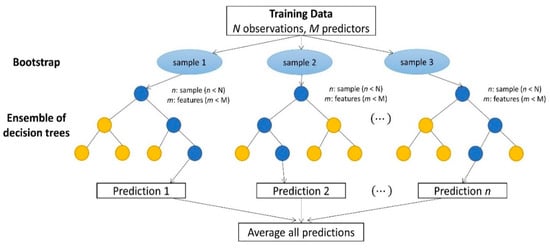Random forest is a popular algorithm widely used for classification and regression problems. It is an ensemble machine learning method that trains several K decision trees (base learners) based on a bagging technique called bootstrap aggregation. First, n samples are taken from the training data using row and feature sampling with replacement. Therefore, only some of the features m<M of the training data will be used as predictors (see Figure 7). Next, each decision tree will be trained on the particular sample. Then, a data point from the test set is given to each corresponding decision tree to predict. Finally, the predictions of each decision tree are aggregated, resulting in the final output.