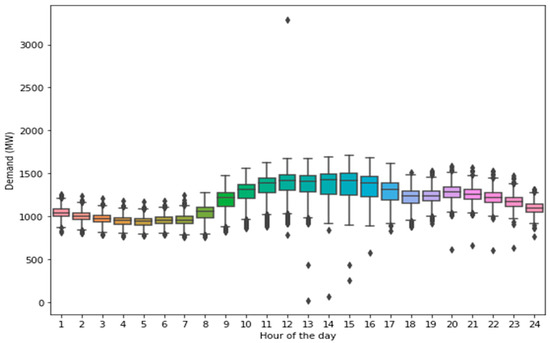 A boxplot was constructed to observe the hourly distribution of the electricity demand. Figure 8 presents the boxplot of the average hourly electricity demand from 2016 to 2019. The electricity demand varies throughout the day, with a prolonged peak period. For example, Figure 8 below shows that the peak period occurs between the 12th hour (noon) and the 15th hour (3:00 p.m.).
