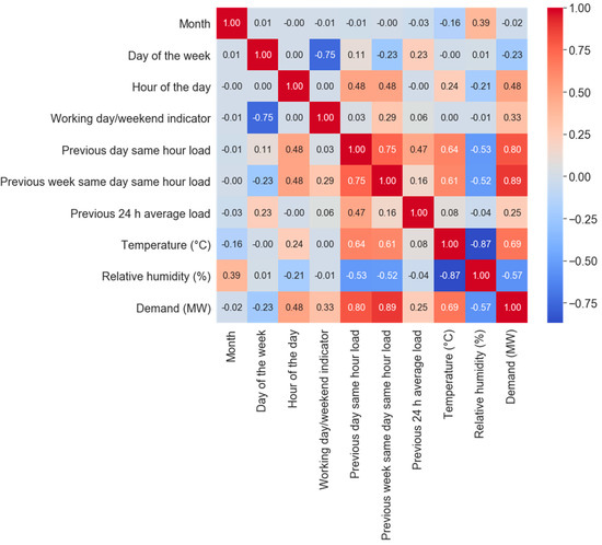 The correlation heatmap is another data exploration tool that helps visualize which features are highly correlated with the electricity demand. For example, based on Figure 9, it can be observed that electricity demand has a strong linear relationship with the following variables: the previous week’s same day same hour load (0.89) and the previous day’s same-hour load (0.8); and a moderate relationship with temperature (0.69).