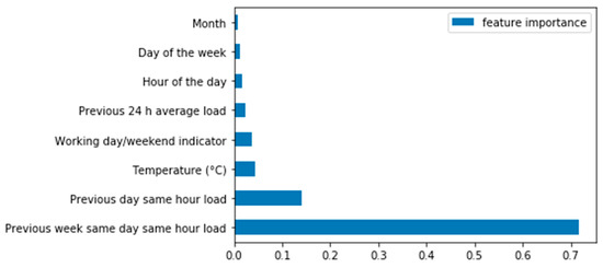 In addition to the correlation heatmap, the Random Forest Regressor was another tool to evaluate feature importance. This built-in tool from the Scikit-learn package is useful for computing feature importance. The results are demonstrated in Figure 10. Once again, the most significant features were the previous week’s same day same hour load (0.72), the previous day’s same-hour load (0.14), and temperature (0.04).