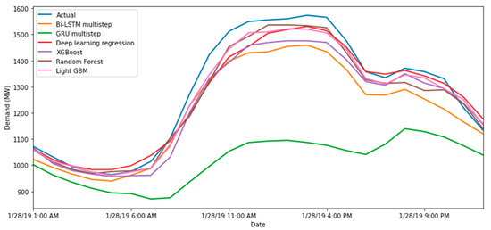 Table 8 and Figure 11 provide the results of the models on the test set. The models were benchmarked and compared regarding training time and four performance metrics. The performance metrics include R-squared (R2), mean squared error (MSE), MAPE, and mean absolute error (MAE). The deep learning regression performed the best for predicting demand one hour ahead, with an R2 value of 0.93 and MAPE of 2.90%. This model consisted of three dense layers with 95 hidden units each. The model required an average training time of 20 min due to the number of hidden layers used. On the other side, Bi-LSTM and GRU had low R2 values of 0.40 and 0.31. Therefore, it became evident that multi-step predictions 24 h ahead are more challenging to perform. The GRU model was more computationally intensive, requiring a training time of 7560 s. Random Forest and LightGBM performed the best among the machine learning models, with an R2 value of 0.92. However, LightGBM provided the fastest training time of 0.8 s. AdaBoost had the worst performance among the machine learning models, with an R2 value of 0.75 and MAPE of 5.70%.
