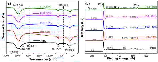 FTIR spectra (a) and XPS spectra (b) of PBC, PU-10%, PUF-10%, PUF-30%, and PUF-50%. PBC stands for biochar prepared with poplar; PU-10 stands for biochar prepared with poplar and urea, and the mass ratio of urea is 10%; PUF-X stands for biochar prepared with poplar and urea formaldehyde, and the mass ratio of urea formaldehyde is 10%, 30%, or 50%.