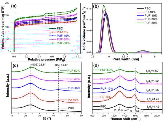 (a) Nitrogen adsorption/desorption isotherms, (b) pore size distributions, (c) XRD patterns, and (d) Raman spectra of PBC, PU-10%, PUF-10%, PUF-30%, and PUF-50%.