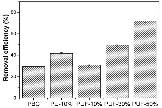 TC removal efficiencies of PBC, PU-10%, PUF-10%, PUF-30%, and PUF-50%.