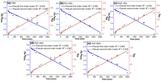 Adsorption kinetics of TC onto (a) PBC, (b) PU-10%, (c) PUF-10%, (d) PUF-30%, and (e) PUF-50%.