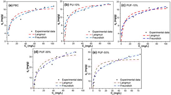 Adsorption isotherms of TC for (a) PBC, (b) PU-10%, (c) PUF-10%, (d) PUF-30%, and (e) PUF-50%.