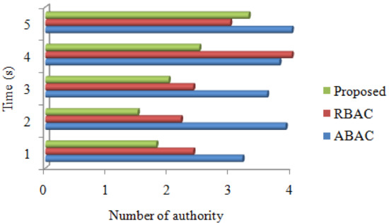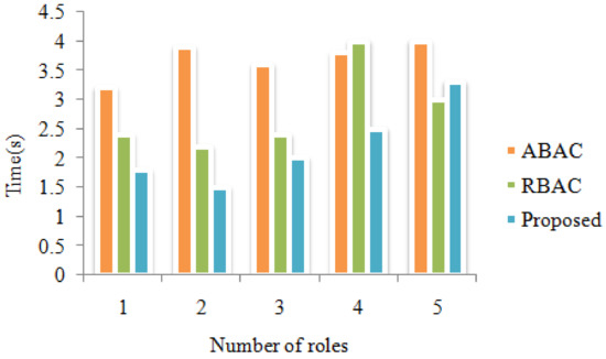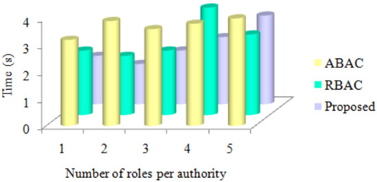 Figure 4 demonstrates time calculated for encrypted file based on number of authority. The more calculation-saving decryption job is loading on a cloud server. The privacy roles of existing techniques consumed more time, and our proposal, less. Various users’ roles were taken, and only the authenticated users accessed the file using the RBAC technique.