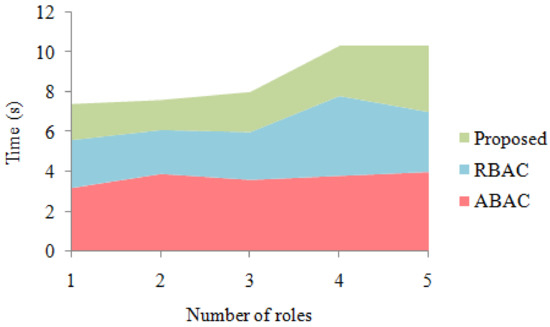 Figure 6 demonstrates the time evaluation for roles of users for decryption. The roles can be the driver of the vehicle, owner, advisor, relative, etc. The coarse-grained access control takes the role and goes into the data repository, and then makes the decision. It has three rules: user, role, and rights. The proposed technique gave the best computational time.