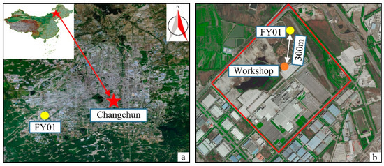 The field test region for this study is indicated in yellow in Figure 1a and is situated in the Lvyuan District, which is southwest of Changchun city (a). The thermal response test is performed in borehole FY01 in the research area of the Feng Yue Motor Company. As seen in Figure 1b, the business intends to construct a ground source heat pump to heat its workshop. The workshop will be 300 m from the heat pump and will be heated by the heat extracted from the rock and soil through buried insulation pipes.
