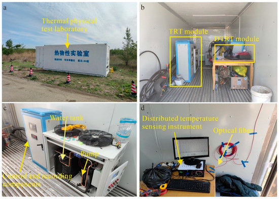 Field thermal response test system. (a) Field testing laboratory. (b) Inside the laboratory. (c) TRT module. (d) DTRT module.
