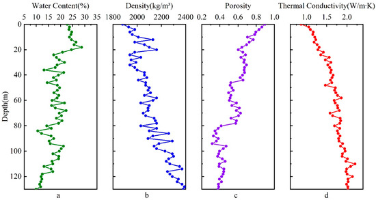 It can be observed that the water content of rock and soil samples generally decreases with increasing depth (Figure 4a), the density of the rock and soil samples generally increases with increasing depth (Figure 4b), and the porosity of the rock and soil samples generally increases gradually with increasing depth (Figure 4c). The thermal conductivity of the rock and soil samples showed an overall increasing trend with increasing depth (Figure 4d). The thermal conductivity of rock and soil taken out of the FY01 borehole measured by TCS is in the range of 0.867–1.965 W/m·K, of which the average thermal conductivity of silty clay is 1.166 W/m·K, the average thermal conductivity of the upper mudstone is 1.653 W/m·K, the average thermal conductivity of argillaceous siltstone is 1.798 W/m·K, and the average thermal conductivity of the lower mudstone is 2.001 W/m·K. Considering the thickness of each layer, the comprehensive thermal conductivity of the FY01 borehole measured by laboratory measurements is 1.692 W/m·K.