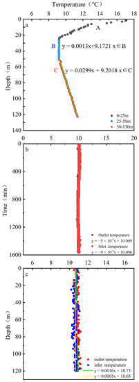 After the installation phase, the temperature-measuring optical fiber was fixed on the U-Tube through the high-temperature-resistant rolling belt and buried in the drill hole together with the pipe. Before the test, the U-Tube embedded in the borehole is filled with water in advance. After the U-Tube is buried, 48 h is needed according to the relevant technical requirements to ensure that the water temperature in the U-Tube and the ground temperature have reached a balanced state. The distributed optical fiber temperature sensor has now recorded temperature data for each depth. Since there is no water circulation, there is no frictional or pump-related heat generated throughout the operation. According to DTRT module measurement data, the surface temperature field within 130 m can be divided into three layers, A, B, and C, namely, the variable temperature stratum, constant temperature stratum, and increasing temperature stratum, respectively, as shown in Figure 5a according to the temperature field changes from shallow to deep. The distribution range of variable temperature strata is 0–25 m. The surface cover layer, atmosphere, and solar radiation all have a significant impact on this layer’s temperature, and the fluctuation varies significantly throughout seasons and geographical areas. The distribution range of the constant temperature stratum is 25–50 m, and the formation temperature is basically stable at 9.13 °C. The constant temperature stratum refers to the interface where the reduction of solar radiant heat to the surface and the conduction and release of heat from the Earth’s internal heat to the surface reach equilibrium at a certain depth and temperature, where the annual variation range of ground temperature is nearly zero. The depth and temperature of the thermostatic layer are mainly influenced by regional structural and geotechnical properties. The lithology of this formation is mudstone, which is stable in nature. The groundwater depth of the study area is 5.5 m, and the groundwater type is mainly loose pore water. The distribution range of the increasing temperature stratum is 50–130 m, and the geothermal gradient is approximately 3.0 °C/100 m. In the range of 50–130 m, the lithology is mainly mudstone, including 16 m of argillaceous siltstone, but the overall thermal conductivity and heat capacity have little change after laboratory measurement. Therefore, the temperature rise in this layer is due to heat transfer from the Earth’s interior. Without considering the variable temperature layer greatly affected by the atmosphere and environment, the average temperature within the research depth range of 130 m, namely, the undistributed ground temperature, was 10.0 °C by using the temperature data measured by a distributed temperature optical fiber.