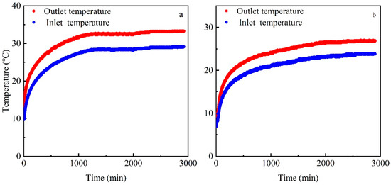 After measuring the initial ground temperature of the mixture of the still water and the formation, the TRT device was attached to the U-Tube in the borehole, the circulating pump was turned on to remove air from the pipe when it was connected, and the water was kept circulating without turning on the heater until the temperature of water in the circulating pipe became constant. This temperature was considered the initial average temperature of the rock and soil mass within the buried depth of the underground heat exchanger. When the pump was opened and the circulation maintained for more than 12 h, the temperature at the water inlet and output holes, as recorded by the TRT module, tended to remain consistent. The temperature at the water inlet and output was constantly monitored for 24 h after it stabilized, as shown in Figure 5b. The undistributed ground temperature obtained by this method is 10.1 °C, which is consistent with the temperature data obtained by measuring the formation temperature.