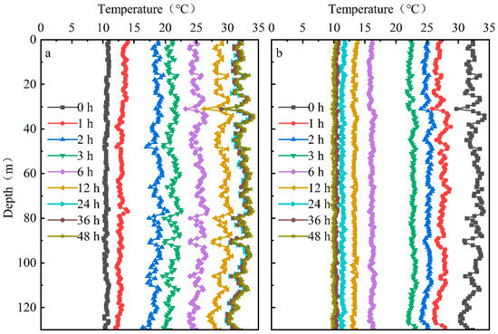 According to the data obtained by the temperature measuring optical fiber, the temperature data at each depth at the nine representative time nodes of 0, 1, 2, 3, 6, 12, 24, 36, and 48 during the heating period of working condition A and ground temperature recovery period after working condition A are selected and plotted as shown in Figure 7. As shown in Figure 7a, 0 h is the undisturbed ground temperature, and the temperature curve is smooth and approximately straight. The temperature at each depth is essentially the same. Faster heat dissipation is associated with the increased thermal conductivity of the formation. As a result, the formation with high thermal conductivity has a comparatively low temperature. Additionally, it is evident that the temperature increase range between 36 h and 48 h is very small and basically tended to be stable. As shown in Figure 7b, after stopping the heat load, the temperature at each depth decreases with time, and the temperature gap between different strata gradually decreases and finally tends to smooth back to the undisturbed ground temperature. The time to recover to the undisturbed ground temperature is less than the set recovery time, which can ensure that the test under condition B still starts from the initial ground temperature.