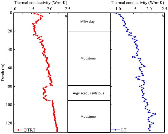 - The variation trend of thermal conductivity of rock and soil mass measured by the DTRT and LT is consistent, and the comprehensive thermal conductivity calculated by the DTRT and TRT is consistent. The thermal conductivity of the rock and soil mass in each layer should be more accurate using the field test results. The field groundwater conditions, moisture content, porosity, and density changes, and the properties of the samples lead to errors in the LT test results.