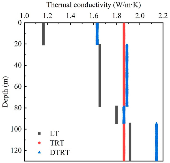 As opposed to an optical fiber temperature sensor, which can measure the thermal conductivity of rock and soil throughout an entire depth range of 130 m, a finite number of rock and soil samples can be collected on site. The thermal conductivity of rock and soil between the same strata has regularity, so the average thermal conductivity of each stratum obtained by the laboratory test (LT) and distributed thermal response test (DTRT) module are calculated. The comprehensive thermal conductivity of the borehole is obtained by the thermal response test (TRT) module. The calculation results are shown in Table 6. The thermal conductivity comparison is shown in Figure 9.