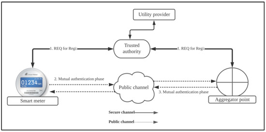 This methodology is applicable in the smart grid context, which is a core field for advanced metering infrastructure. Figure 1 demonstrates the proposed system model. In this work, we look at three entities: one trusted authority connected to a secure channel with a utility provider. The second component of this methodology is called the data aggregator point, while the smart meter is the third component.