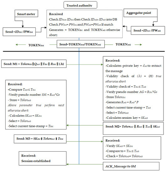 In this phase, the smart meter and aggregator point asks a trusted authority for permission to join the mutual authentication process. The smart meter and aggregator point send credentials to a trusted authority which are verified, based on pre-loaded databases and generates TokenSM and TokenAG. The registration process is shown below.
